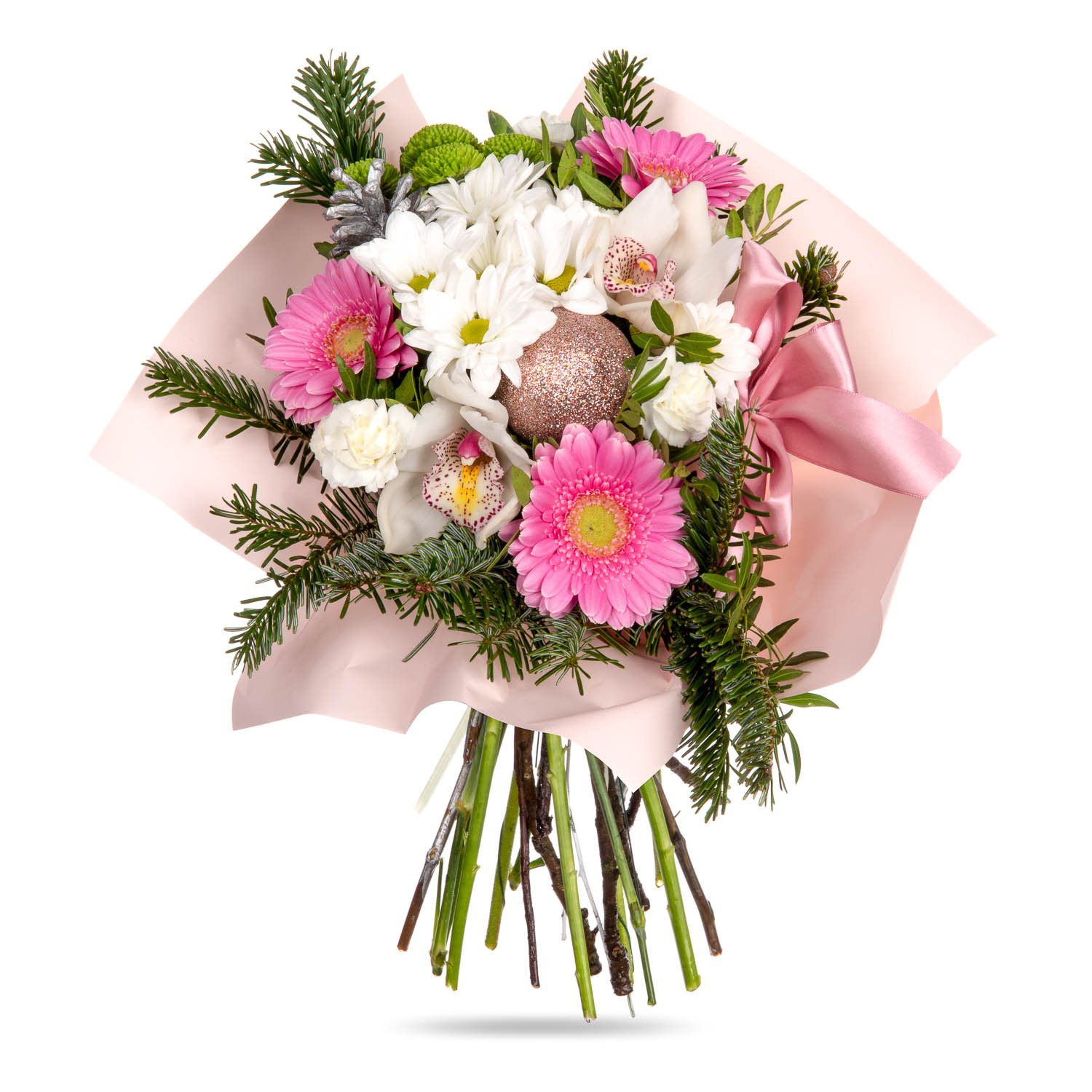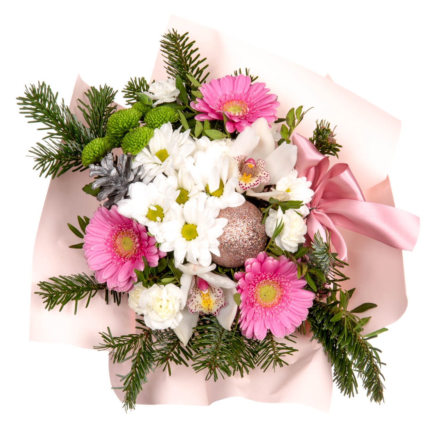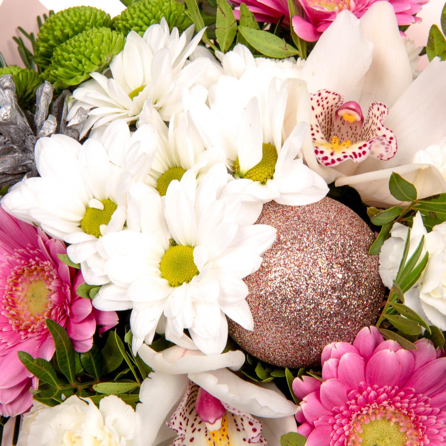 Chrysanthemums, Mini Gerberas, Bush Carnations, Santini Chrysanthemums, Orchid blossom, Sleeve, Decorative bow & Decorative greenery (10 stems)