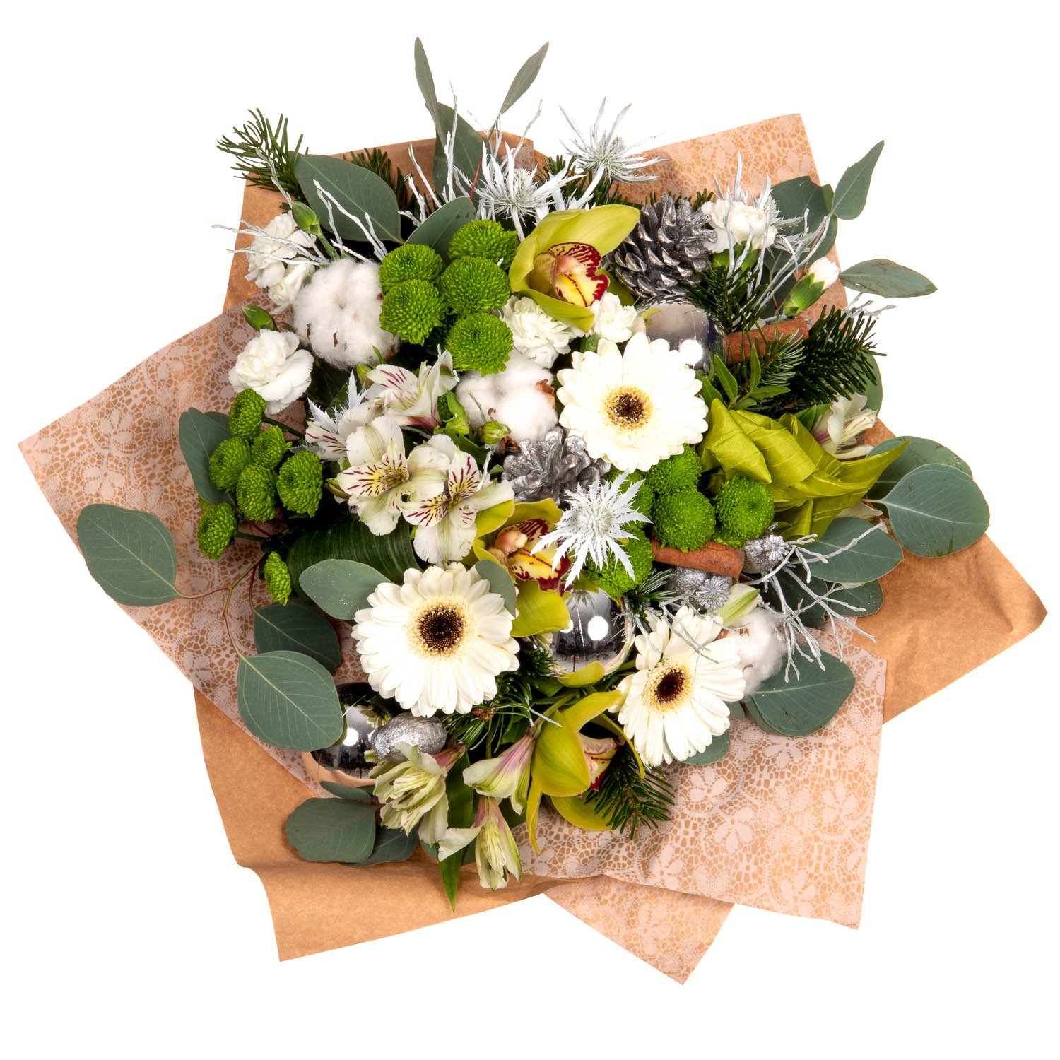 Santini Chrysanthemums, Mini Gerberas, Eryngos, Orchid blossom, Bush Carnations, Alstroemerias, Cotton, Decorative bow & Decorative greenery (21 stems)