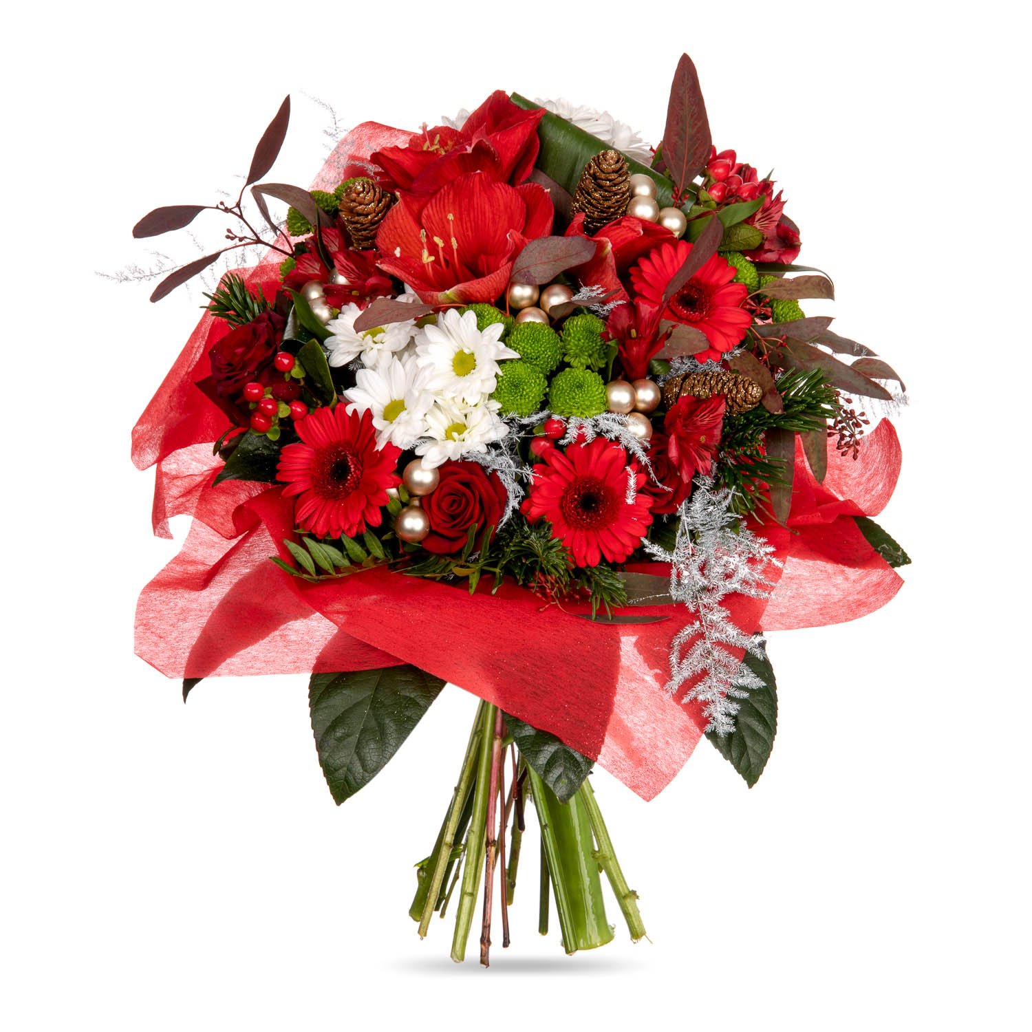 Amarillos, Chrysanthemums, Roses, Mini Gerberas, Santini Chrysanthemums, Hypericum, Decorative bow, Sleeve & Decorative greenery (18 stems)