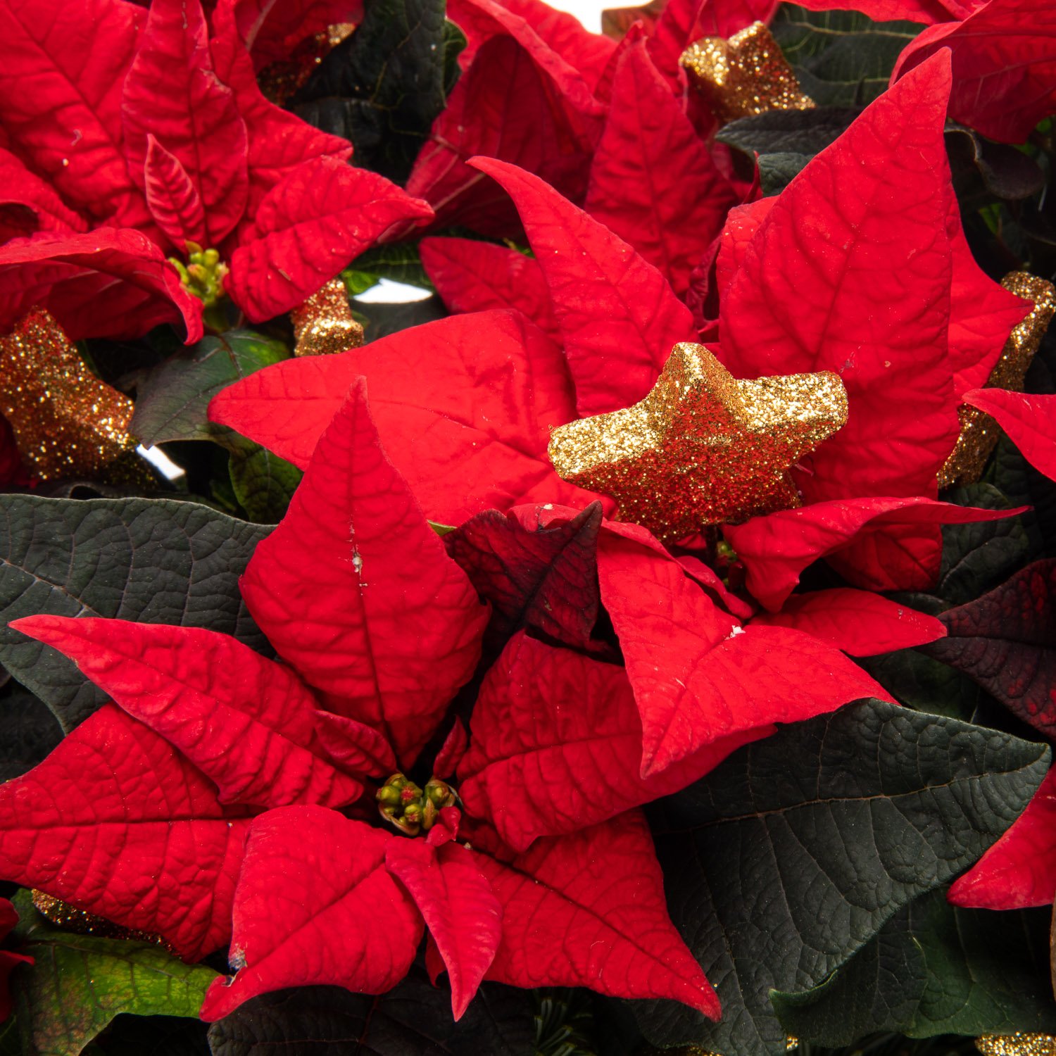 3 ks červená vánoční hvězda, vánoční dekorace, proutěný koš a dekorativní mašle