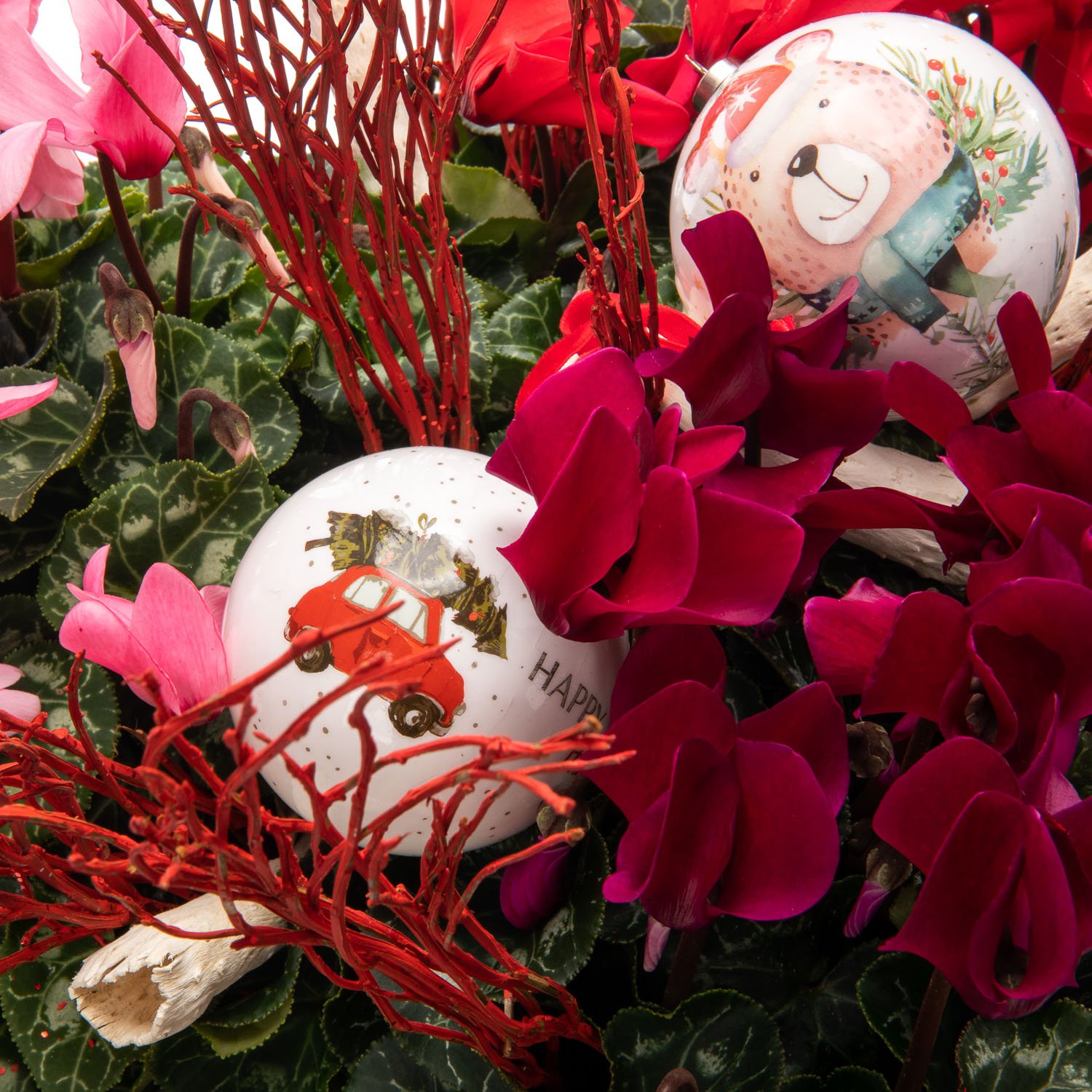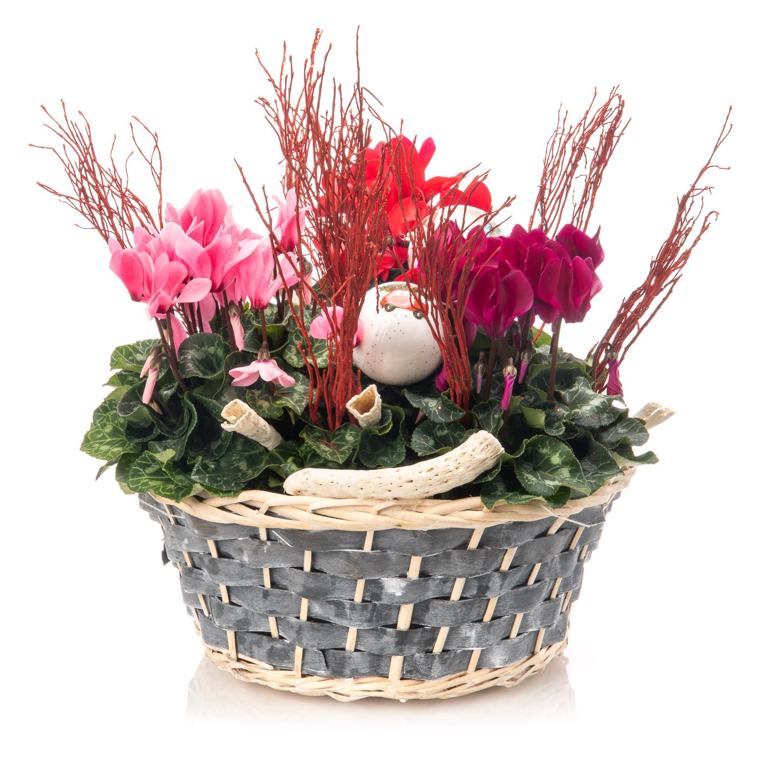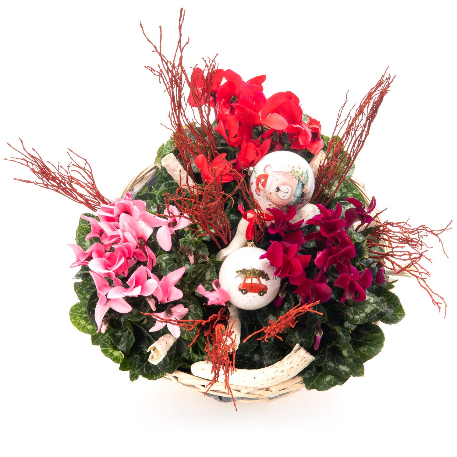 3 ks cyclámen (brambořík), vánoční dekorace, proutěný koš a okrasná mašle