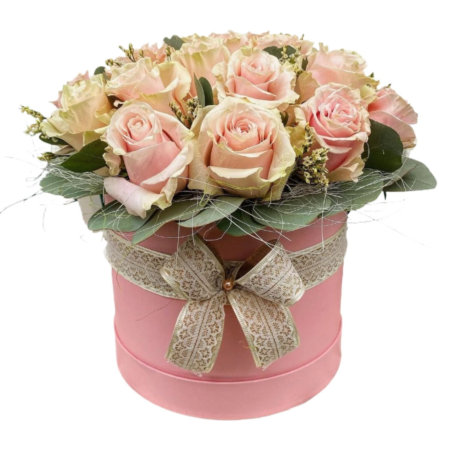 Luxusní růžový flower box s jemnými růžemi je dokonalým dárkem pro ty, které si zaslouží něco výjimečného. Každá růže je pečlivě vybraná a naaranžovaná do kulaté růžové krabičky ozdobené krajkovou stuhou.